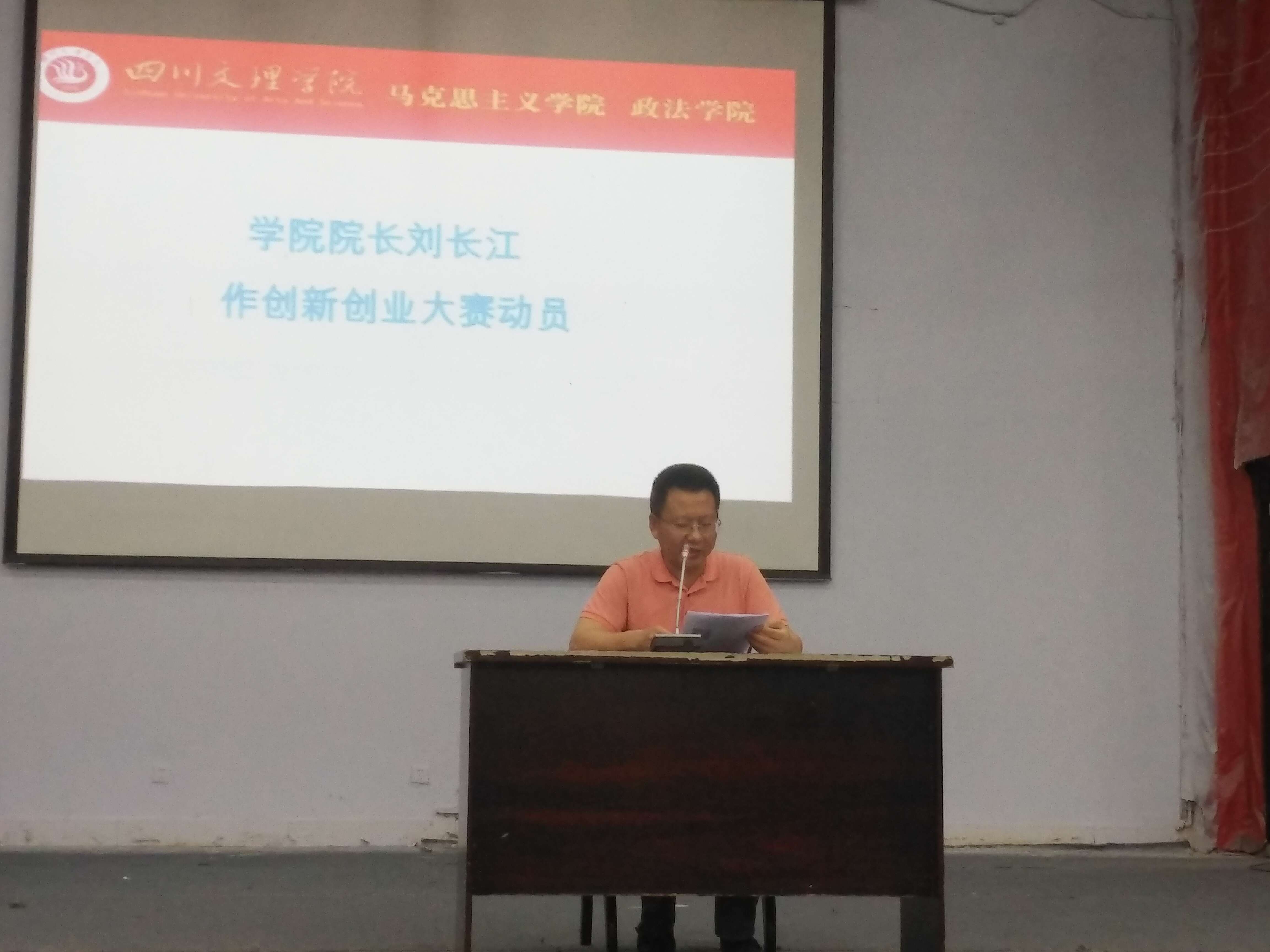 刘长江院长从创新创业大赛的宗旨、目的与任务、比赛要求与报名等方面作大赛动员。刘院长讲到,创新创业是时代的主旋律,"互联网+"学生创新创业大赛是为了加快创新创业人才培养,持续激发广大学生创新创业热情,展示创新创业教育成果,搭建学生创新创业项目与社会资源对接平台。本次大赛的目的与任务是以赛促学,以赛促教,以赛促创。他详细地讲解了比赛的要求与报名方式,鼓励大家根据“互联网+”结合学院学科专业特点积极申报参赛项目,尤其要利用学科专业优势,组织参赛团队成员与企业和教师等组成法治中国小分队、政策宣讲小分队或项目团队组团等形式深入革命老区、贫困地区,接受思想洗礼、学习革命精神、传承红色基因。