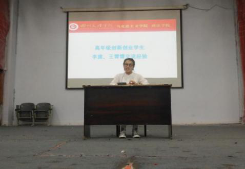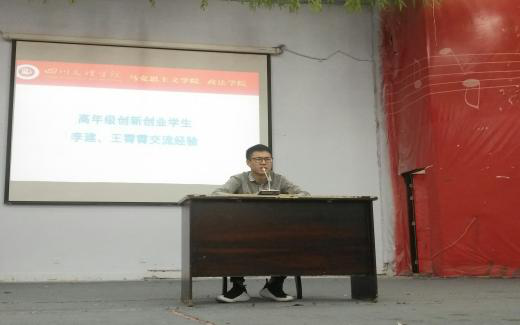 高年级创新创业学生李建、王宵宵分享创新创业经验。两位同学结合自身的创新创业亲身经历,讲述了他们创新创业的历程,鼓励同学们要有创新创业的勇气,勇于创业,敢于创新。