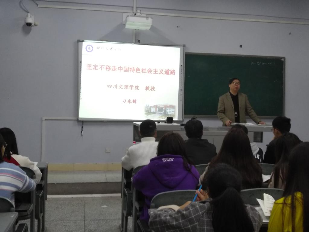 2018年11月12日晚,学校校长、四川省有突出贡献的优秀专家刁永锋教授在一教楼208教室为财经管理学院2017级1、2、8班同学讲授题为“坚定不移走中国特色社会主义道路”的形势与政策课。财经管理学院党总支副书记(主持工作)李兴贵老师、sunbet申搏官方网站形势与政策教研室主任梁云老师、辅导员魏晓军老师一同聆听了刁校长的授课。