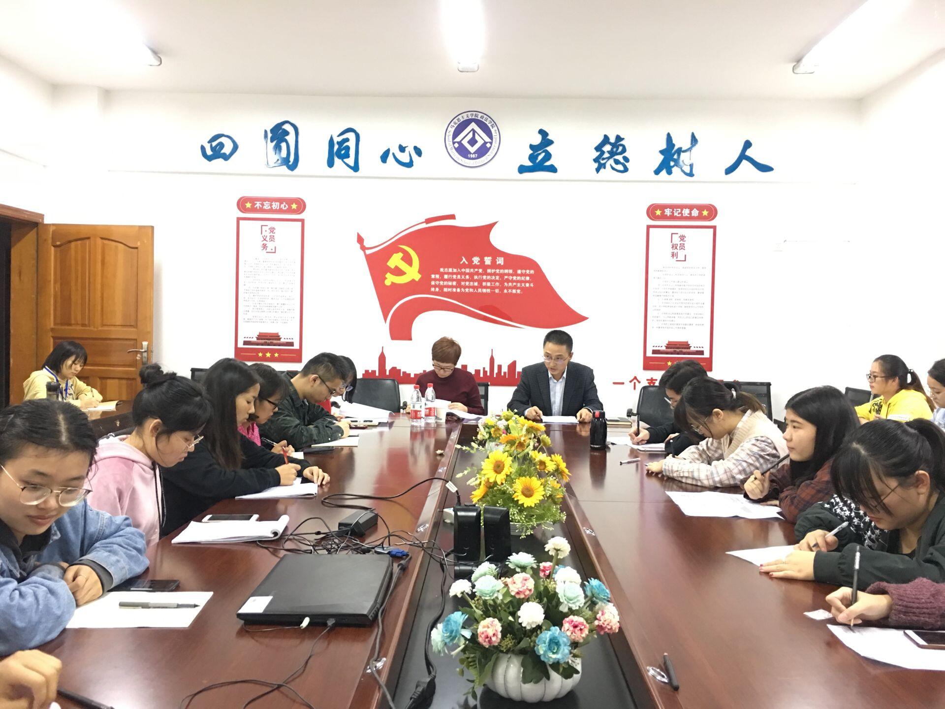 2019年10月10日下午5:30,申搏官网学生党支部对照党章党规找差距专题会在博文楼611会议室召开,党总支副书记吴辉兵、辅导员曾亚、政法学院全体学生党员参加会议。学校主题教育督导员、离退休工作处处长郑静到会指导工作。