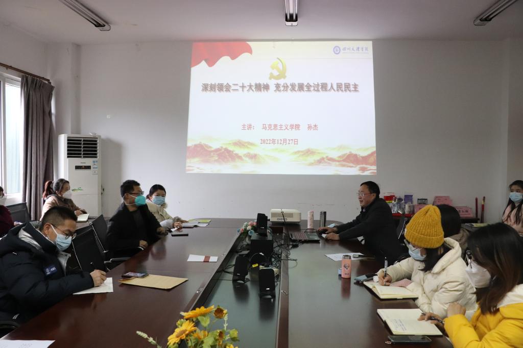 为深入学习贯彻党的二十大精神,2022年12月27日,院长孙杰教授在博文楼611会议室为sunbet申搏官方网站全体教师做“深刻领会二十大精神 充分发展全过程人民民主”的专题报告。