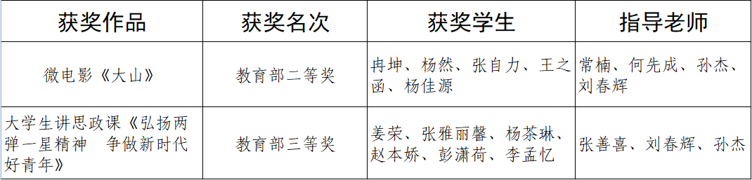申搏官网原创微电影《大山》、大学生讲思政课《弘扬两弹一星精神 争做新时代好青年》分别获教育部二等奖和三等奖