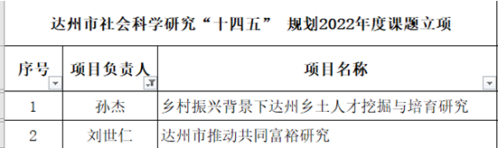 近日,达州市社科联、巴中市社科联发布了达州市、巴中市社会科学研究“十四五”规划2022年度课题立项通报。据统计,sunbet申搏官方网站教师共立项课题10项,具体立项名单请参见下表。请获准立项的老师认真开展课题研究工作,确保课题按时高质量完成,为地方经济社会发展提供智力支撑。