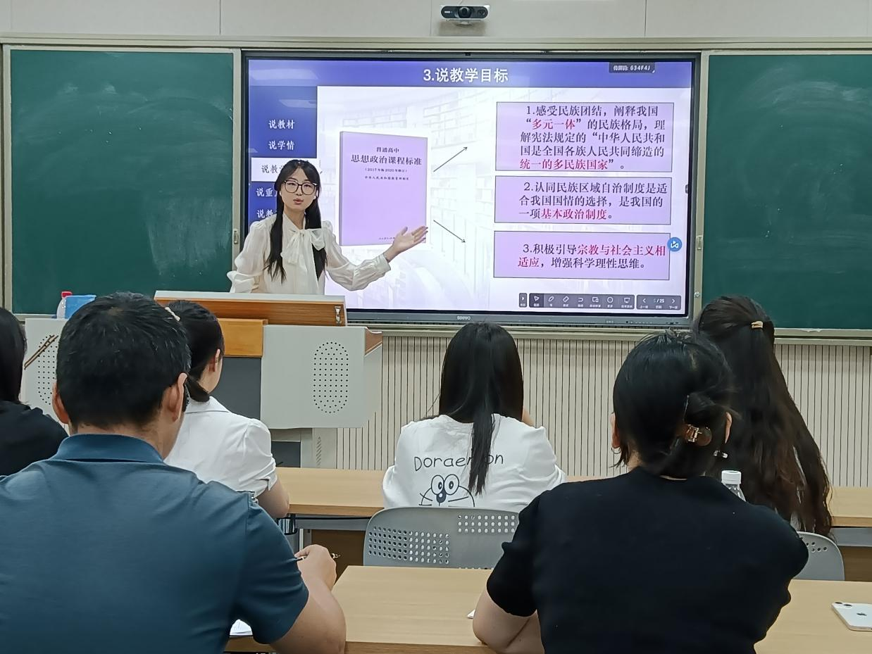 刘洋、王莉、曹红梅结合最新教育部对中学政治课教学相关要求进行点评,她们指出选手的教学目标紧密结合最新版本的课程标准核心素养要求、教学内容设计充实精要、PPT课件演示符合现代教育理念、多媒体运用恰当,充分肯定申搏官网师范生的教学风采,并对选手在教学环节的设计、师生互动的组织等方面提出改进意见。